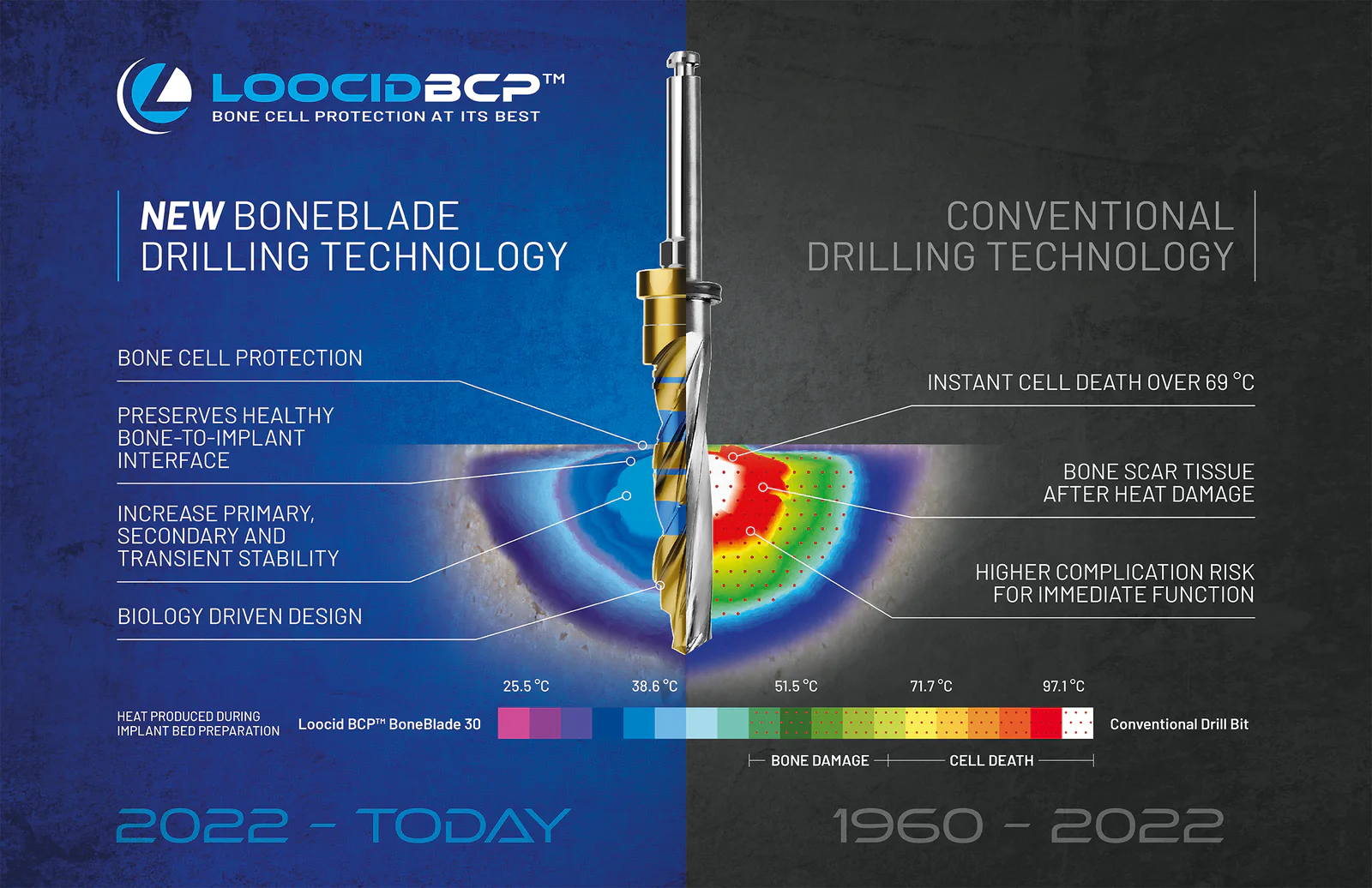 Above 47°C, vital bone cells start to die. The Loocid BCPTM drill significantly reduces the temperature during implant bed preparation compared to conventional implant drills.